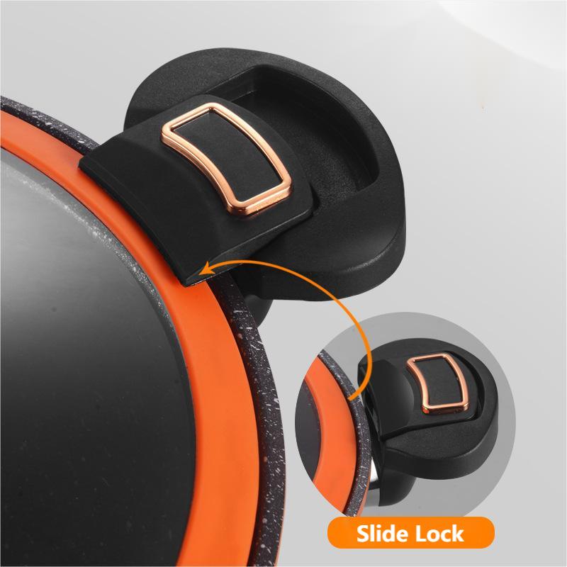 SCORREVOLE PER BLOCCARE DESIGN -L'innovativo meccanismo scorrevole per bloccare garantisce una tenuta sicura, preservando sapori e sostanze nutritive durante la cottura. Goditi la tranquillità sapendo che i tuoi pasti sono cucinati alla perfezione.